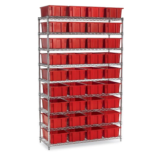 Features60X24X63 SHELVING W/RED TOTESChrome Wire Shelving with QUANTUM Stack and Nest Totes is perfect for factories, shops, and warehouses.Adjustable chrome wire shelves.Choose from two shelving configurations: shelving that includes red open top totes with reinforcing side ribs, or shelving with blue dividable grid containers that can be sub-divided into small compartments. Chrome Wire Shelving with QUANTUM Stack and Nest Totes?
